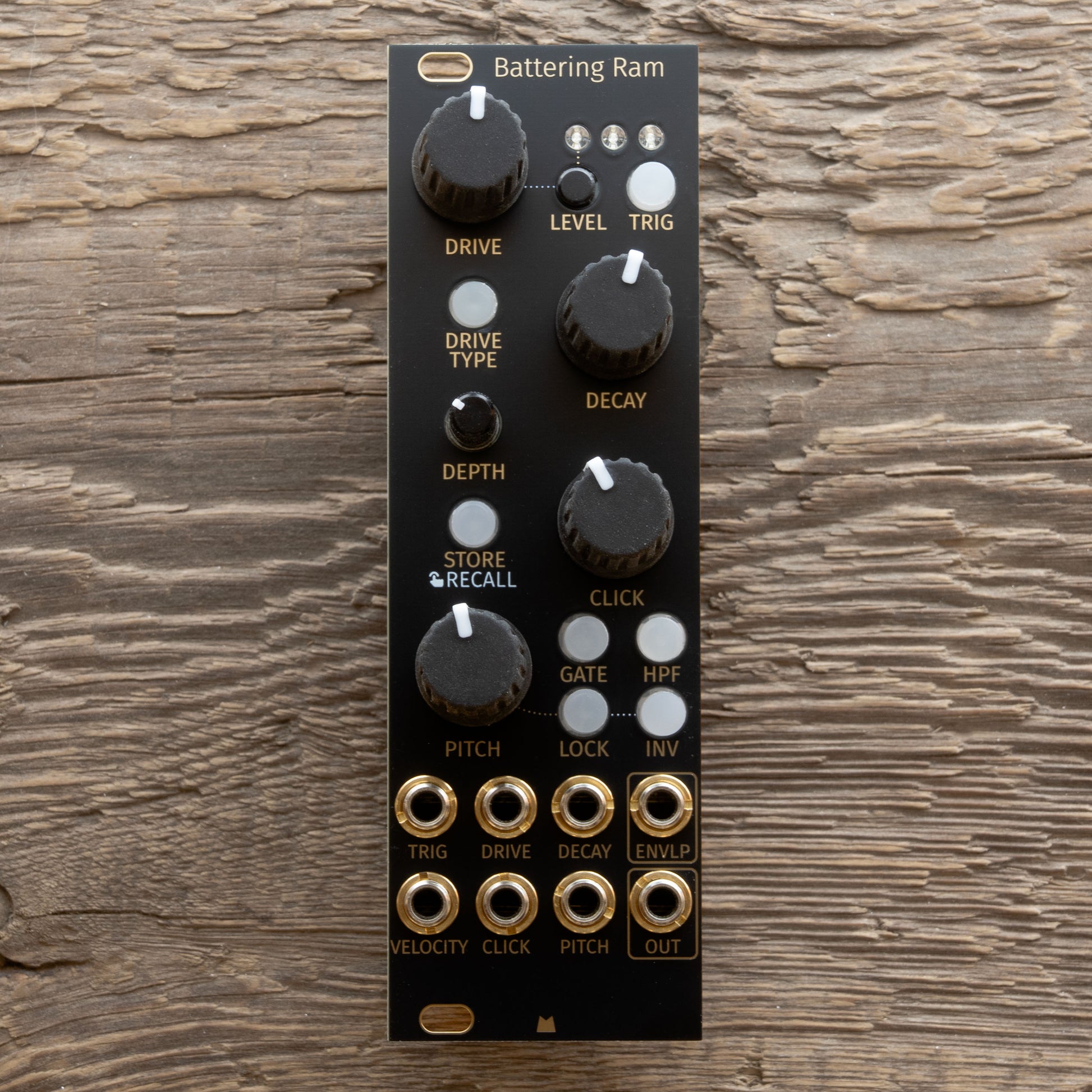 Black & Gold replacement panel for Shakmat Battering Ram eurorack module.