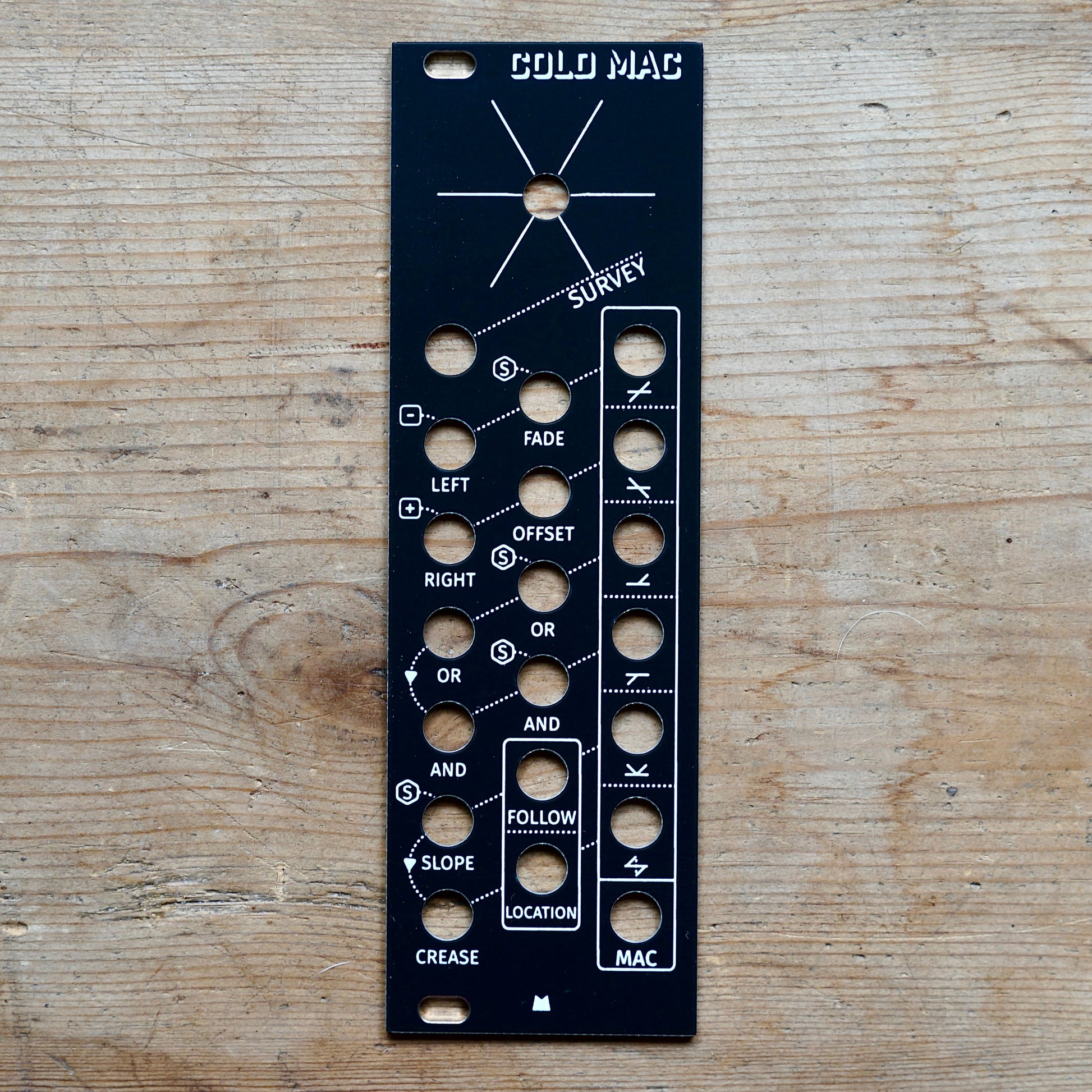 Black replacement panel for Mannequins Cold Mac eurorack module.