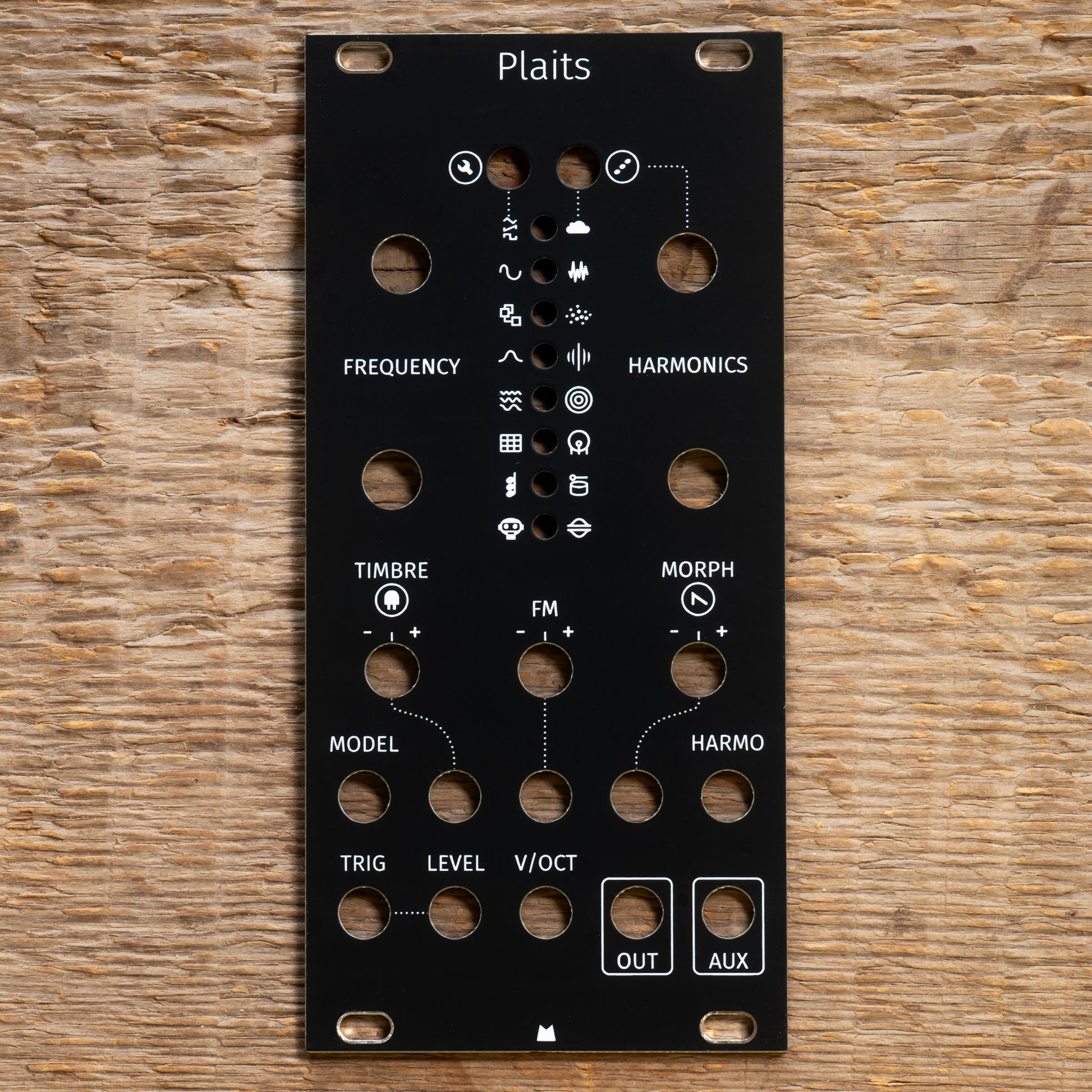 Black replacement panel for Mutable Instruments Plaits eurorack module.