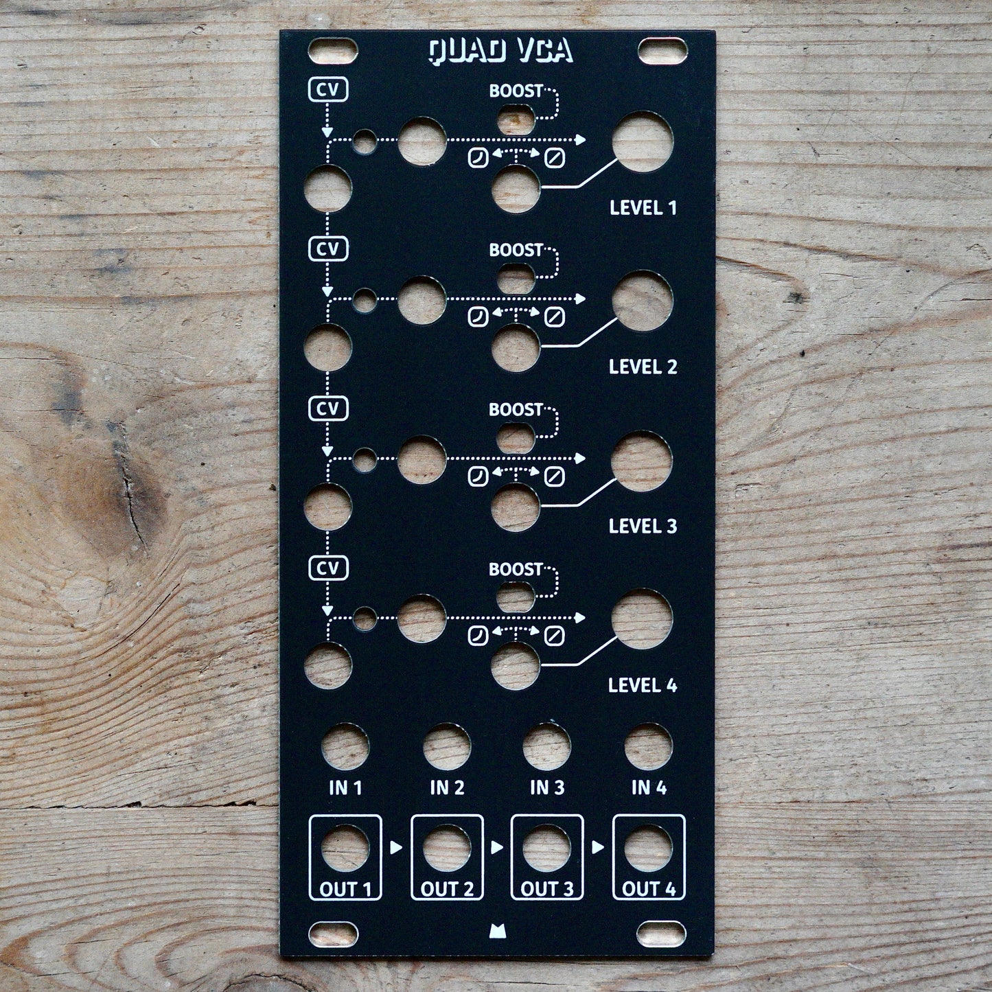 Black replacement panel for Intellijel Quad VCA eurorack module.
