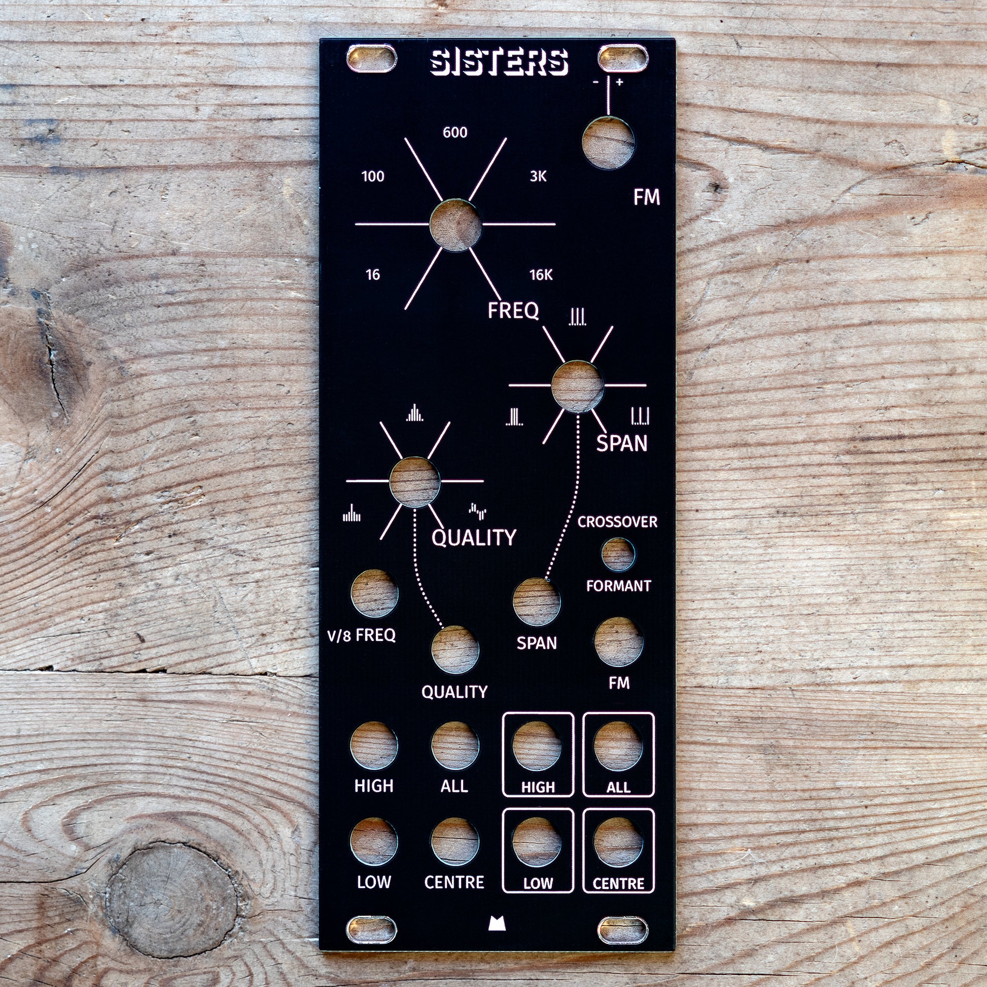Black replacement panel for Mannequins Three Sisters eurorack module.
