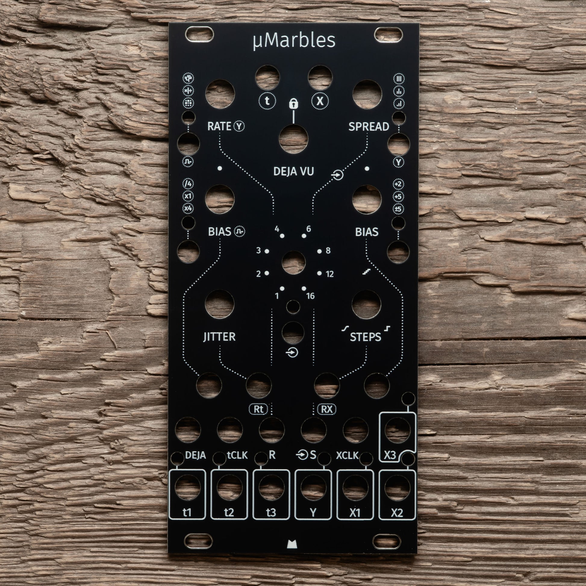 Black replacement panel for the Mutable Instruments Marbles-derived JakPlugg designed µMarbles / uMarbles / Pachinko eurorack module.